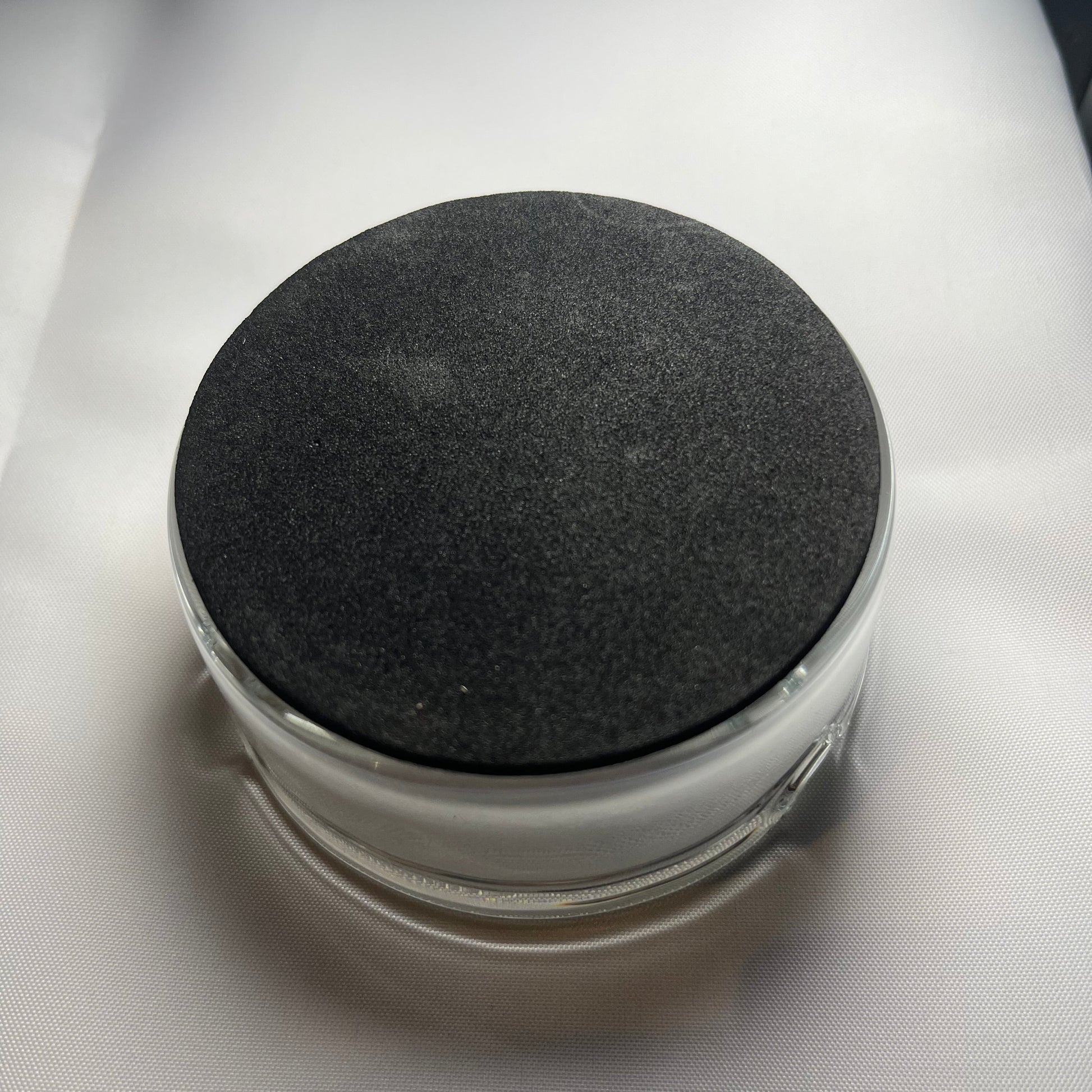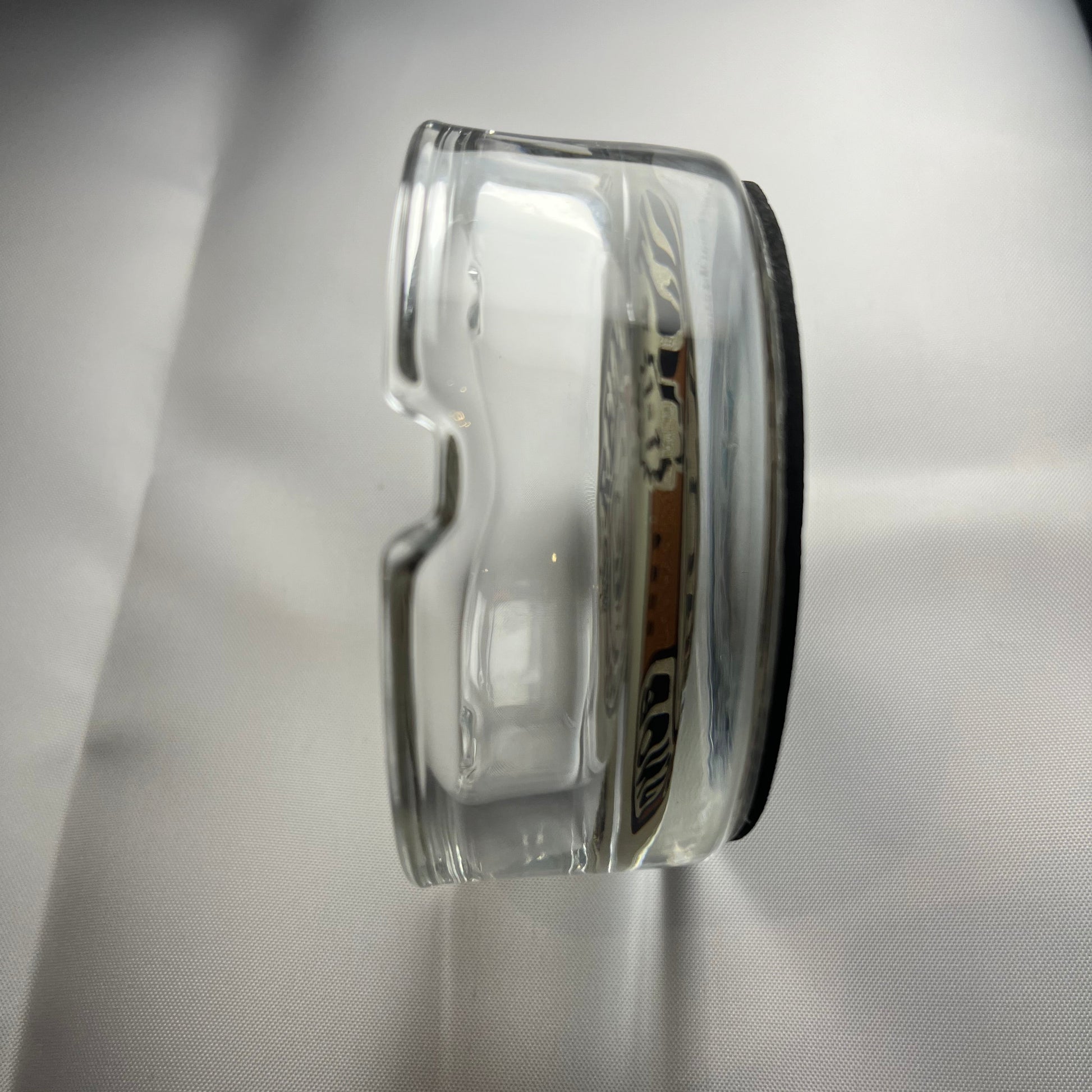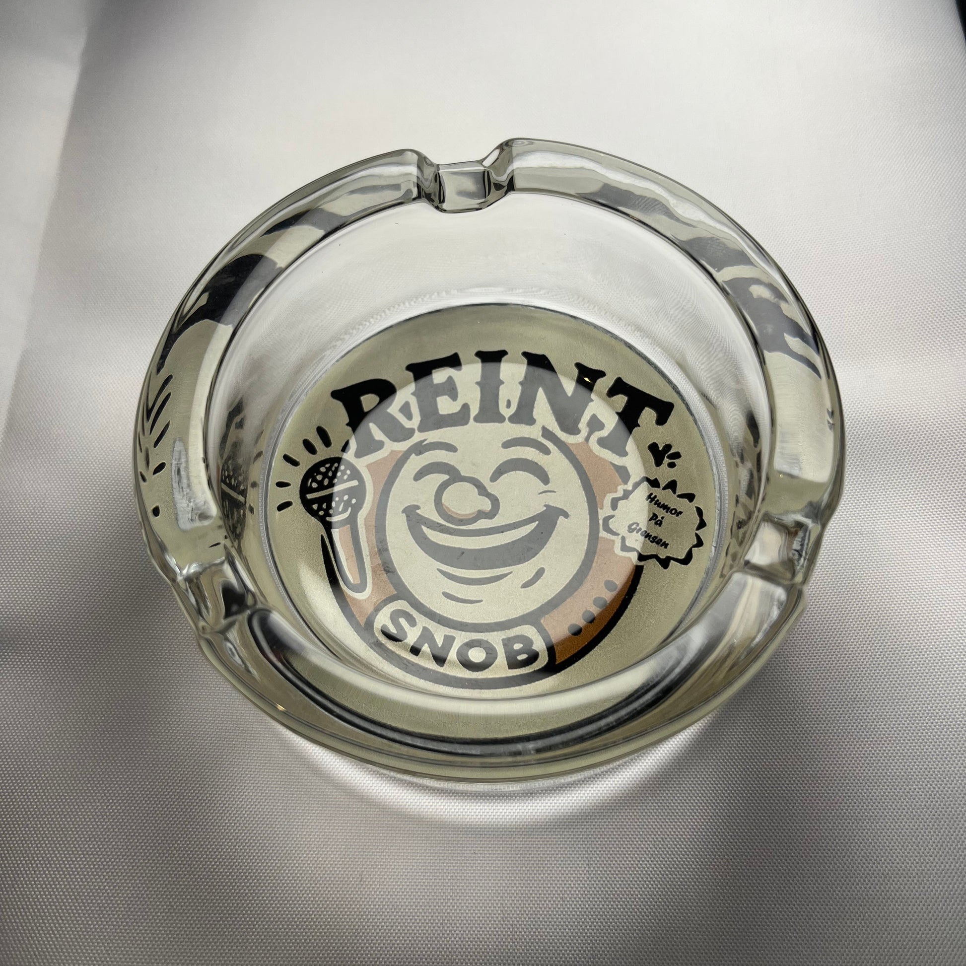 Et lite og stilrent askebeger i gjennomsiktig glass med Reint Snob-logoen støpt inn i bunn med med sklisikker base.