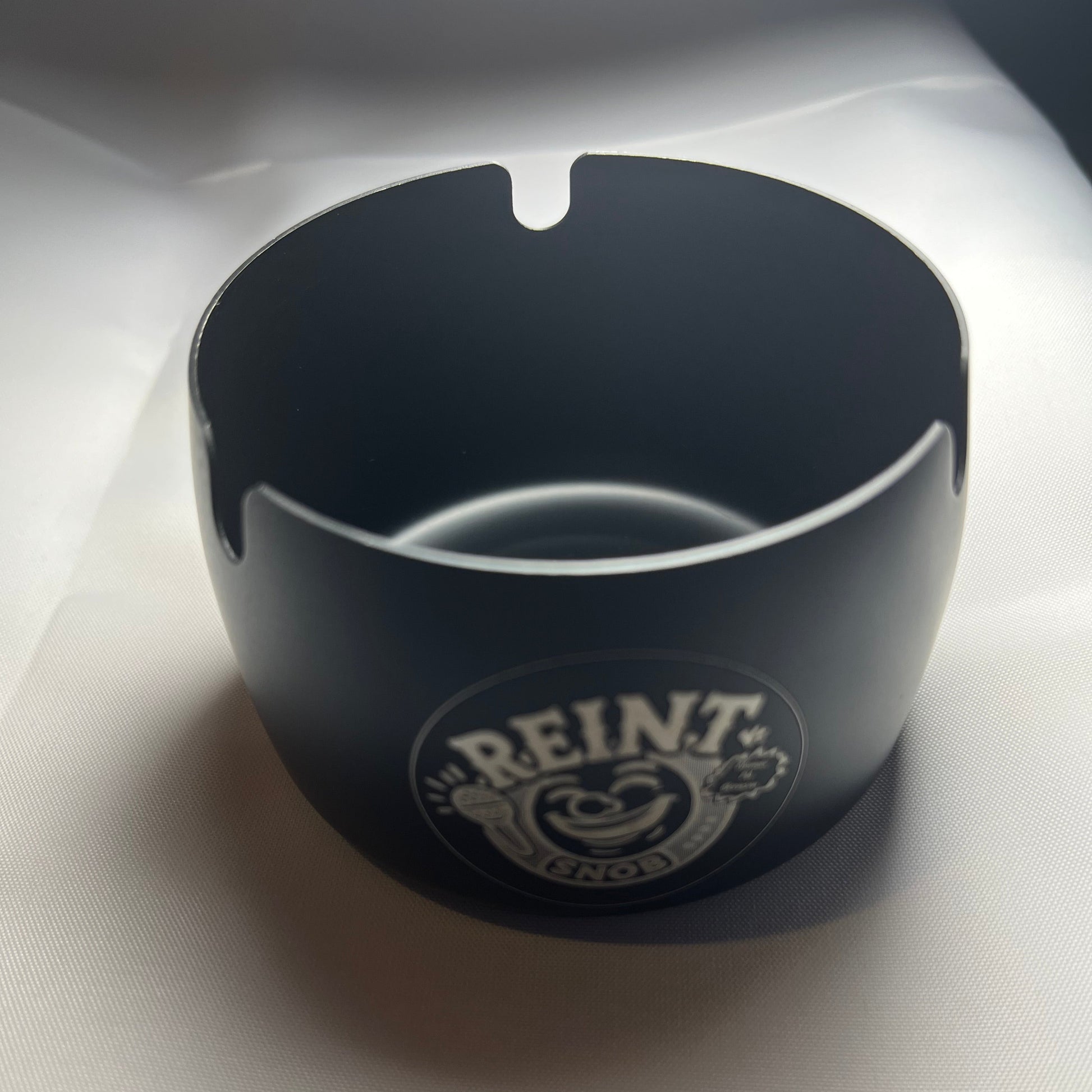 Lasergravert Reint Snob-logo på et svart askebeger i stål med palmetredesign.